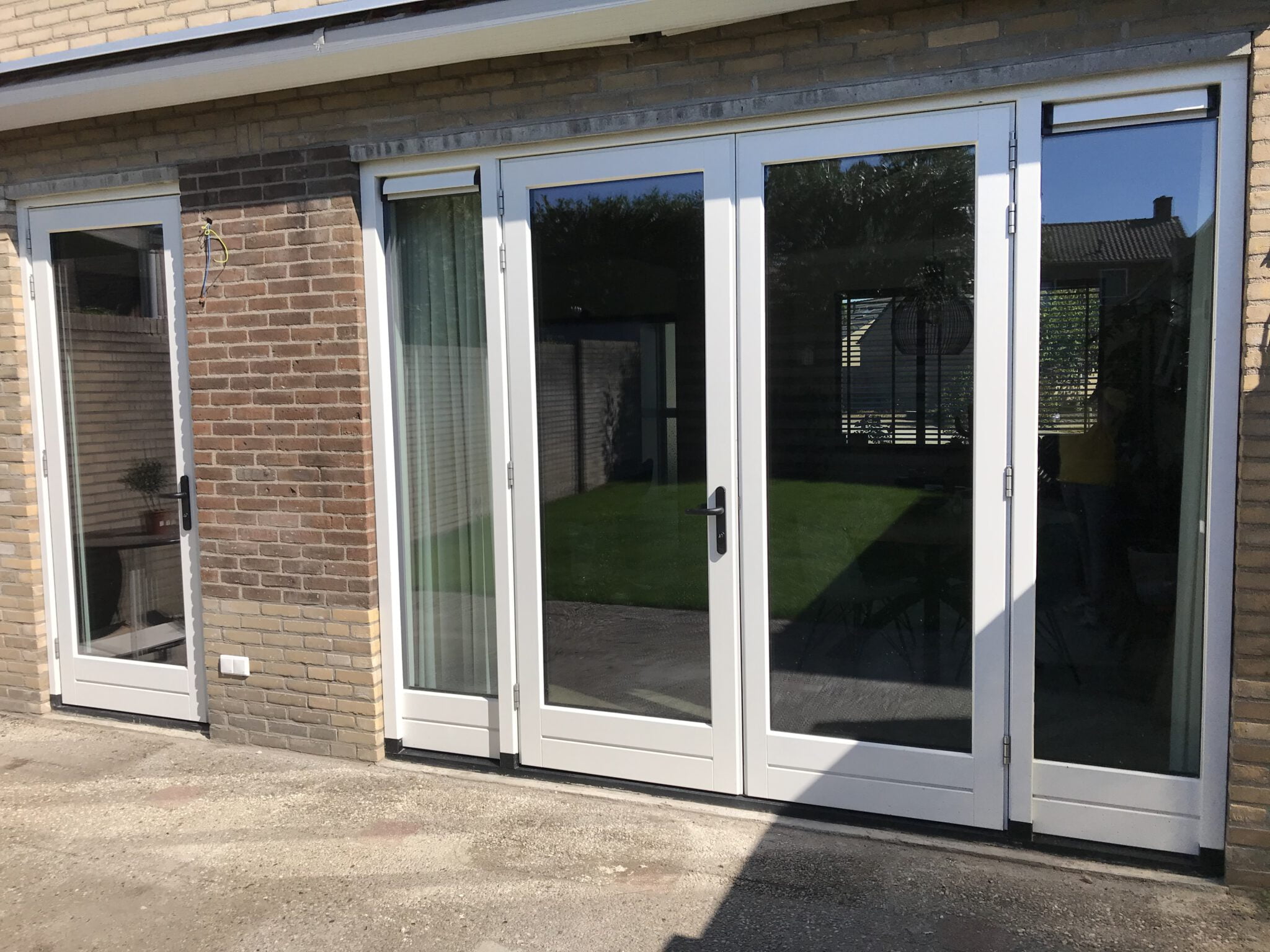 Dit zijn onze houten tuindeuren met twee zijlichten voorzien van een borstwering. Hiermee loopt de glaslijn van de tuindeuren door in de zijlichten. Bijkomend voordeel is dat de borstwering opspattend vuil bij regenval tegenhoud en de ruiten niet zo snel smerig worden.